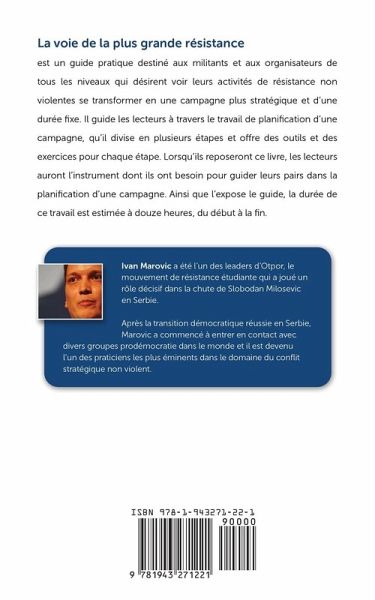 La voie de la plus grande résistance: un guide étape par étape pour la planification des campagnes non violentes est destiné aux activistes et organisateurs de tous niveaux, qui souhaitent faire évoluer leurs activités de résistance non violente vers des campagnes plus stratégiques à durée déterminée. Il guide ses lecteurs à travers le processus de planification d'une campagne. Il en explique les différentes étapes et propose pour chacune d'elles des outils et des exercices. Au terme du Guide, les lecteurs auront acquis ce dont ils ont besoin pour conduire leurs pairs à travers le processus de planification d'une campagne. Tel qu'il est expliqué dans le guide, ce processus devrait prendre environ 12 heures du début à la fin. Ce guide comprend deux parties. La première présente et contextualise les outils de planification d'une campagne et leurs objectifs. Elle explique également la logique qui sous-tend ces outils et la manière dont on peut les modifier pour les adapter au contexte d'un groupe particulier. La seconde partie fournit des fiches pédagogiques faciles à reproduire et à partager pour utiliser chacun de ces outils, et explique comment intégrer ces outils dans le processus de planification.