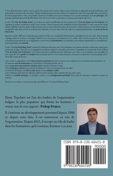 T'es-tu déjà demandé ce qu'il y a sous le capot d'un pickup artist à succès ? Que se passe-t-il lorsque tu apprends un tas de techniques, mais qu'au fond, tu veux juste être toi-même ? Tout le monde peut jouer un rôle, mais est-ce vraiment ça, le but ? Est-il possible d'être soi-même et de réussir quand même ? Oui, c'est possible. Derrière le véritable succès avec les femmes, il n'y a pas de techniques, mais des principes. Des principes profonds qui seront abordés dans ce livre. Et si tu vis selon ces principes, tu réussiras, peu importe qui tu es. Le livre "La Voie du Pickup Artist" est né deux ans après la publication de mon premier livre "L'art de réussir avec les femmes". En regardant en arrière, j'ai découvert qu'il y avait certaines choses à ajouter pour compléter la vision d'ensemble. Ce sont souvent des choses subtiles, difficiles à deviner, même si elles sont juste sous tes yeux. Il faut des années de rencontres et d'interactions avec des femmes pour les comprendre. Mais dans ce livre, je te donne tout, déjà prêt. C'est une mise à jour de ce que tu as appris jusqu'à présent, un nouveau niveau dans le Jeu. Quand tu étudies différentes méthodes pour séduire les filles, tu es bombardé d'informations contradictoires de tous côtés. Tout le monde a quelque chose de nouveau à t'enseigner. Parfois, tu ne sais pas par où commencer, tu es confus. Alors ce livre est pour toi. Avec lui, les contradictions prennent fin, car il t'apprendra à voir les choses en profondeur. Les techniques sont toujours superficielles et contradictoires, mais les principes sont éternels. Le livre "La Voie du Pickup Artist" contient des éléments utiles pour tous : des techniques, du contenu amusant et même des conseils pour un bon jeu en ligne. Tout cela est accompagné de nombreux rapports et anecdotes de terrain. Cependant, je recommande de lire d'abord "L'art de réussir avec les femmes", où les bases sont mieux expliquées pour les débutants, car ce livre-ci est en quelque sorte une suite. Ce livre a pour but de te guider et t'inspirer dans le chemin que tu es sur le point d'entamer. Es-tu prêt à emprunter la voie du pickup artist ? Alors elle est juste devant toi. Avec ce livre, tu apprendras : ¿ Une façon de penser puissante qui mène au succès, non seulement avec les femmes mais aussi dans la vie ¿ Comment créer de l'attraction avec les femmes et la maintenir toute une vie ¿ Les secrets pour entretenir des relations saines et garder la flamme vivante ¿ Des techniques avancées pour aborder les femmes et créer une connexion forte avec elles ¿ Comment développer une forte estime de soi et une confiance solide ¿ Des techniques puissantes de séduction utilisées par des pickup artists expérimentés aux styles variés ¿ Riche en conseils pratiques, en exemples concrets et en enseignements profonds d'un coach de rencontres renommé et expert en relations Investis en toi et dans ta vie amoureuse dès aujourd'hui avec "La Voie du Pickup Artist".