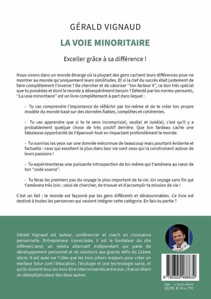 Nous vivons dans un monde étrange où la plupart des gens cachent leurs différences pour ne montrer au monde qu'uniquement leurs similitudes. Et si la clef du succès était justement de faire complètement l'inverse ? De chercher et de valoriser "ton facteur X", ce don très spécial que tu possèdes et dont le monde a désespérément besoin ? Détesté par les normo-pensants, "La voie minoritaire" est un livre complètement à part dans lequel :- Tu vas comprendre l'importance de réfléchir par toi-même et de te créer ton propre modèle du monde basé sur des données fiables, complètes et cohérentes.- Tu vas apprendre que si tu te sens incompris(e), seul(e) et isolé(e), c'est qu'il y a probablement quelque chose de très positif derrière. Que ton fardeau cache une fabuleuse opportunité de t'épanouir tout en impactant profondément le monde.- Tu ouvriras les yeux sur une donnée méconnue de beaucoup mais pourtant évidente et factuelle : ceux qui excellent le plus dans leur vie sont ceux qui la construisent autour de leurs passions !- Tu expérimenteras une puissante introspection de toi-même qui t'amènera au coeur de "ton code source".- Tu feras les premiers pas du voyage le plus important de ta vie. Un voyage sans fin qui t'amènera très loin : celui de chercher, de trouver et d'accomplir ta mission de vie !C'est un fait : le monde est façonné par les gens différents et déraisonnables. Ce livre est destiné à toutes les personnes qui veulent intégrer cette catégorie. En fais-tu partie ?