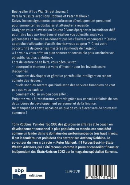 Best-seller #1 du Wall Street Journal ! Vers la réussite avec Tony Robbins et Peter Mallouk ! Suivez les enseignements des maîtres en développement personnel pour surmonter les obstacles et atteindre la réussite. Craignez-vous d'investir en Bourse ? Vous épargnez et investissez déjà pour faire face aux imprévus et réaliser vos objectifs, mais vos placements en bourse ne donnent pas les résultats escomptés ? Quelle approche d'allocation d'actifs devriez-vous adopter ? C'est votre opportunité de percer les mystères du monde de l'argent ! « La voie » vous offre un plan concret et accessible pour atteindre vos objectifs les plus ambitieux. Lors de lecture de ce livre, vous découvrirez : - pourquoi le moment est venu d'investir pour les investisseurs disciplinés ; - comment développer et gérer un portefeuille intelligent en tenant compte des risques ; - quels sont les secrets que l'industrie des services financiers ne veut pas que vous sachiez ; - comment choisir un bon conseiller ; Préparez-vous à transformer votre vie grâce aux conseils éclairés de ces deux icônes du développement personnel et de la finance. Ne manquez pas cette occasion unique de vous élever vers de nouveaux sommets !