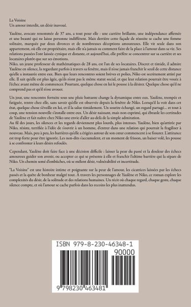 La Voisine Un amour interdit, un désir inavoué. Yaulène, avocate renommée de 37 ans, a tout pour elle : une carrière brillante, une indépendance affirmée et une beauté qui ne laisse personne indifférent. Mais derrière cette façade de réussite se cache une femme solitaire, marquée par deux divorces et de nombreuses déceptions amoureuses. Elle vit seule dans son appartement, où elle est propriétaire, mais elle n'a jamais su comment faire de la place à l'amour dans sa vie. Ses relations passées l'ont laissée cynique et distante, et aujourd'hui, elle préfère se concentrer sur sa carrière et ses locataires plutôt que sur ses émotions. Niko, un jeune professeur de mathématiques de 28 ans, est l'un de ses locataires. Discret et timide, il admire Yaulène en silence, la regardant parfois à travers sa fenêtre, mais il n'ose jamais franchir le seuil de cette distance qu'elle a instaurée entre eux. Bien que leurs rencontres soient brèves et polies, Niko est secrètement attiré par elle. Il sait qu'elle est plus âgée, qu'ils n'ont pas le même statut social, et que leur relation pourrait être vouée à l'échec avant même de commencer. Pourtant, quelque chose en lui le pousse à la désirer. Quelque chose qu'il ne comprend pas et qu'il n'ose avouer. Un jour, une rencontre fortuite sous une pluie battante change la dynamique entre eux. Yaulène, trempée et fatiguée, rentre chez elle, sans savoir qu'elle est observée depuis la fenêtre de Niko. Lorsqu'il la voit dans cet état, quelque chose s'éveille en lui, et il la salue timidement. Un sourire échangé, un regard partagé... et tout à coup, une tension nouvelle s'installe entre eux. Un désir naissant, mais non exprimé, qui ébranle les certitudes de Yaulène et fait naître chez Niko une envie d'aller au-delà de la simple admiration. Au fil des jours, les silences et les regards deviennent plus lourds, plus intenses. Yaulène, bien qu'attirée par Niko, résiste, terrifiée à l'idée de s'ouvrir à un homme, d'entrer dans une relation qui pourrait la fragiliser à nouveau. Mais, peu à peu, les barrières qu'elle a érigées autour de son cur commencent à se fissurer. L'attirance est trop forte pour être ignorée. Les non-dits s'accumulent, et un moment de frisson, un baiser volé, les pousse à se confronter à leurs désirs refoulés. Cependant, Yaulène doit faire face à une décision difficile : laisser la peur du passé et la douleur des échecs amoureux guider son avenir, ou accepter ce qui se présente à elle et franchir l'ultime barrière qui la sépare de Niko. Un chemin semé d'embûches, où se mêlent désir, vulnérabilité et incertitude. "La Voisine" est une histoire intime et poignante sur la peur de l'amour, les cicatrices laissées par les échecs passés et la quête de bonheur malgré tout. À travers les personnages de Yaulène et Niko, ce roman explore les complexités du désir, de la solitude et des relations humaines. Un récit où chaque regard, chaque geste, chaque silence compte, et où l'amour se cache parfois dans les recoins les plus inattendus.