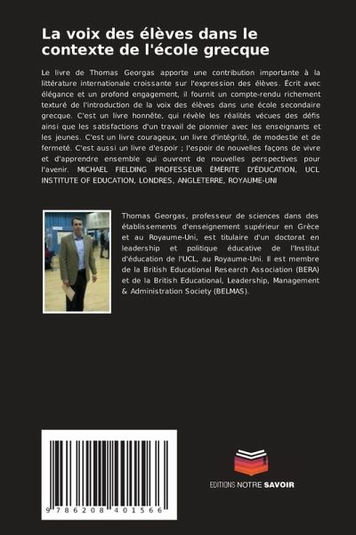 Le livre de Thomas Georgas apporte une contribution importante à la littérature internationale croissante sur l'expression des élèves. Écrit avec élégance et un profond engagement, il fournit un compte-rendu richement texturé de l'introduction de la voix des élèves dans une école secondaire grecque. C'est un livre honnête, qui révèle les réalités vécues des défis ainsi que les satisfactions d'un travail de pionnier avec les enseignants et les jeunes. C'est un livre courageux, un livre d'intégrité, de modestie et de fermeté. C'est aussi un livre d'espoir ; l'espoir de nouvelles façons de vivre et d'apprendre ensemble qui ouvrent de nouvelles perspectives pour l'avenir. MICHAEL FIELDING PROFESSEUR ÉMÉRITE D'ÉDUCATION, UCL INSTITUTE OF EDUCATION, LONDRES, ANGLETERRE, ROYAUME-UNI