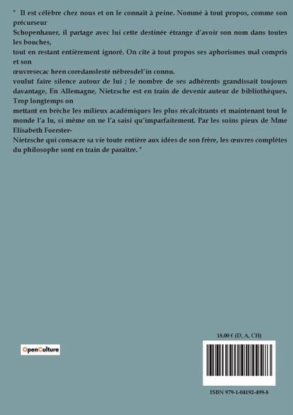 " Il est célèbre chez nous et on le connaît à peine. Nommé à tout propos, comme son précurseur Schopenhauer, il partage avec lui cette destinée étrange d¿avoir son nom dans toutes les bouches, tout en restant entièrement ignoré. On cite à tout propos ses aphorismes mal compris et son ¿uvresecac heen coredanslesté nèbresdel¿in connu. voulut faire silence autour de lui ; le nombre de ses adhérents grandissait toujours davantage, En Allemagne, Nietzsche est en train de devenir auteur de bibliothèques. Trop longtemps on mettant en brèche les milieux académiques les plus récalcitrants et maintenant tout le monde l¿a lu, si même on ne l¿a saisi qüimparfaitement. Par les soins pieux de Mme Elisabeth Foerster- Nietzsche qui consacre sa vie toute entière aux idées de son frère, les ¿uvres complètes du philosophe sont en train de paraître. "