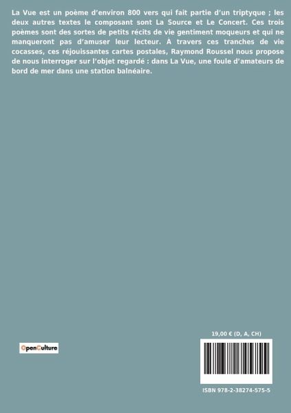 La Vue est un poème d¿environ 800 vers qui fait partie d¿un triptyque ; les deux autres textes le composant sont La Source et Le Concert. Ces trois poèmes sont des sortes de petits récits de vie gentiment moqueurs et qui ne manqueront pas d¿amuser leur lecteur. À travers ces tranches de vie cocasses, ces réjouissantes cartes postales, Raymond Roussel nous propose de nous interroger sur l¿objet regardé : dans La Vue, une foule d¿amateurs de bord de mer dans une station balnéaire.