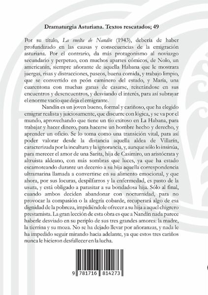 Por su título, "La vuelta de Nandín" (1943), debería de haber profundizado en las causas y consecuencias de la emigración asturiana. Por el contrario, da más protagonismo al noviazgo secundario y perpetuo, con muchos apartes cómicos, de Nolo, un americanín, siempre añorante de aquella Habana que le mostrara juergas, risas y distracciones, paseos, buena comida, y trabajo limpio, que se convertido en peón caminero del estado, y María, una cuarentona con muchas ganas de casarse, reiterándose en sus encuentros y desencuentros, y desviando el interés, para así subrayar el enorme vacío que deja el emigrante. Nandín es un joven bueno, formal y cariñoso, que ha elegido emigrar realista y juiciosamente, que discurre con lógica, y se va por el mundo, aprovechando que tiene un tío exitoso en La Habana, para trabajar y hacer dinero, para hacerse un hombre hecho y derecho, y aprender un oficio. Se lo toma como una transición vital, para así poder valorar desde la distancia aquella aldea de Villarín, caracterizada por la incultura y la ignorancia, y, aunque sólo lo insinúa, para merecer el amor de una Sarita, hija de Casimiro, un aristócrata y altruista aldeano, con más sombras que luces, ya que ha estado escamoteando durante un decenio a su hija aquella correspondencia ultramarina llamada a convertirse en su alimento emocional, y que ahora, por sus locuras, despilfarros y la enfermedad, es pasto de la usura, y está obligado a parasitar a su bondadosa hija. Sólo al final, cuando ambos deciden abandonar con nocturnidad, para no provocar la compasión o la alegría cobarde, recuperará algo de esa dignidad de la pobreza, impidiéndole ofrecer a su hija a aquel chigrero prestamista. La gran lección de esta obra es que a Nandín nada parece haberle desviado en su periplo de sus tres grandes amores: la madre, la tierrina y su moza. No se ha dejado llevar por añoranzas, y nada le ha impedido seguir mirando hacia adelante, ya que estos tres cariños nunca le hicieron desfallecer en la lucha.