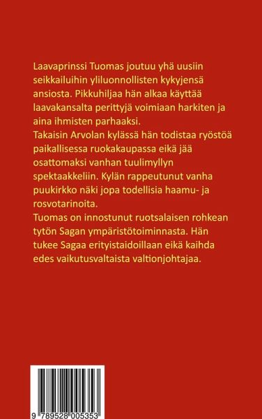 Laavaprinssi Tuomas joutuu yhä uusiin seikkailuihin yliluonnollisten kykyjensä ansiosta. Pikkuhiljaa hän alkaa käyttää laavakansalta perittyjä voimiaan harkiten ja aina ihmisten parhaaksi. Takaisin Arvolan kylässä hän todistaa ryöstöä paikallisessa ruokakaupassa eikä jää osattomaksi vanhan tuulimyllyn spektaakkeliin. Kylän rappeutunut vanha puukirkko näki jopa todellisia haamu- ja rosvotarinoita. Tuomas on innostunut ruotsalaisen rohkean tytön Sagan ympäristötoiminnasta. Hän tukee Sagaa erityistaidoillaan eikä kaihda edes vaikutusvaltaista valtionjohtajaa.