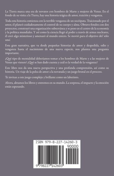 La Tierra marca una era de novatos con hombres de Marte y mujeres de Venus. En el fondo de su visita a la Tierra, hay una historia trágica de amor, traición y venganza. Toda esta historia comienza con la terrible venganza de un sociópata. Traicionado por el amor, él planeó cuidadosamente el control de su cuerpo y alma. Obtuvo fondos con dos proyectos, construyó una organización subterránea y se puso en el centro de la economía y la política mundiales. Y así como la ciencia llegó al poder a través de armas nucleares, él creó algo misterioso y amenazó al mundo entero. Se movió para el objetivo del 'sólo uno'. Esta gran narrativa, que va desde pequeñas historias de amor y despedida, odio y venganza hasta el nacimiento de una nueva especie, nos plantea una pregunta importante. ¿Qué tipo de mentalidad deberíamos tomar a los hombres de Marte y a las mujeres de Venus que vienen? ¿Qué se han dado cuenta y cuál es la verdad de la venganza? Este libro nos da una nueva perspectiva y una profunda comprensión, así como su historia. Un viaje de la pelea de amor a la novatada y un juego brutal en el proceso. Te invitan a este juego complejo y brillante como un laberinto. Ahora, abramos los libros y entremos en su mundo. La sorpresa, el impacto y la emoción están esperando.