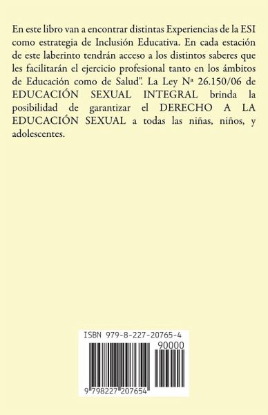 En este libro van a encontrar distintas Experiencias de la ESI como estrategia de Inclusión Educativa. En cada estación de este laberinto tendrán acceso a los distintos saberes que les facilitarán el ejercicio profesional tanto en los ámbitos de Educación como de Salud". La Ley Nª 26.150/06 de EDUCACIÓN SEXUAL INTEGRAL brinda la posibilidad de garantizar el DERECHO A LA EDUCACIÓN SEXUAL a todas las niñas, niños, y adolescentes.