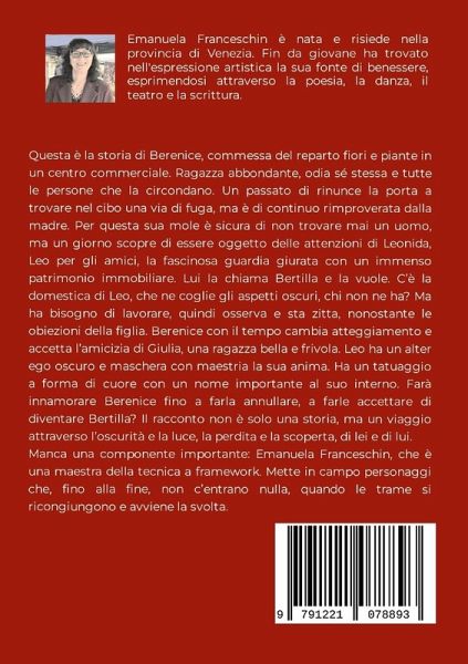 Questa è la storia di Berenice, commessa del reparto fiori e piante in un centro commerciale. Ragazza abbondante, odia sé stessa e tutte le persone che la circondano. Un passato di rinunce la porta a trovare nel cibo una via di fuga, ma è di continuo rimproverata dalla madre. Per questa sua mole è sicura di non trovare mai un uomo, ma un giorno scopre di essere oggetto delle attenzioni di Leonida, Leo per gli amici, la fascinosa guardia giurata con un immenso patrimonio immobiliare. Lui la chiama Bertilla e la vuole. C'è la domestica di Leo, che ne coglie gli aspetti oscuri, chi non ne ha? Ma ha bisogno di lavorare, quindi osserva e sta zitta, nonostante le obiezioni della figlia. Berenice con il tempo cambia atteggiamento e accetta l'amicizia di Giulia, una ragazza bella e frivola. Leo ha un alter ego oscuro e maschera con maestria la sua anima. Ha un tatuaggio a forma di cuore con un nome importante al suo interno. Farà innamorare Berenice fino a farla annullare, a farle accettare di diventare Bertilla? Il racconto non è solo una storia, ma un viaggio attraverso l'oscurità e la luce, la perdita e la scoperta, di lei e di lui. Manca una componente importante: Emanuela Franceschin, che è una maestra della tecnica a framework. Mette in campo personaggi che, fino alla fine, non c'entrano nulla, quando le trame si ricongiungono e avviene la svolta.