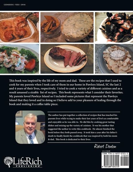 This book was inspired by the life of my mom and dad. These are the recipes that I used to cook for my parents when I took care of them in our home in Pawleys Island, SC the last 2 and 4 years of their lives, respectively. I tried to cook a variety of different cuisines and as a result amassed a sizable list of recipes. This book represents what I consider their favorites. My parents loved Pawleys Island so I included some pictures that represent the Pawleys Island that they loved and in doing so I believe add to your pleasure of leafing through the book and making it a coffee table piece.