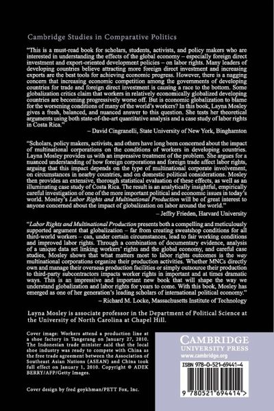 Labor Rights and Multinational Production investigates the relationship between workers' rights and multinational production. Mosley argues that some types of multinational production, embodied in directly owned foreign investment, positively affect labor rights. But other types of international production, particularly subcontracting, can engender competitive races to the bottom in labor rights. To test these claims, Mosley presents newly generated measures of collective labor rights, covering a wide range of low- and middle-income nations for the 1985-2002 period. Labor Rights and Multinational Production suggests that the consequences of economic openness for developing countries are highly dependent on foreign firms' modes of entry and, more generally, on the precise way in which each developing country engages the global economy. The book contributes to academic literature in comparative and international political economy, and to public policy debates regarding the effects of globalization.