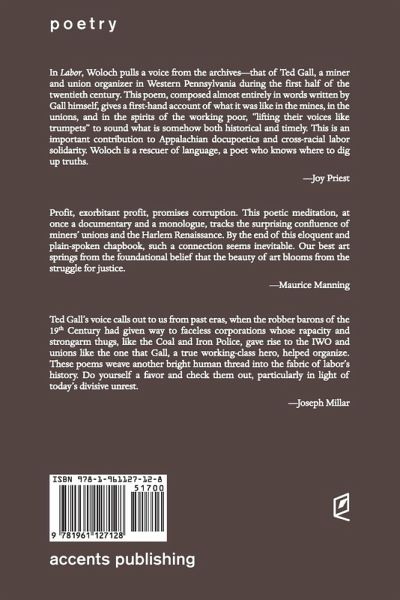 "In Labor, Woloch pulls a voice from the archives-that of Ted Gall, a miner and union organizer in Western Pennsylvania during the first half of the twentieth century. This poem, composed almost entirely in words written by Gall himself, gives a first-hand account of what it was like in the mines, in the unions, and in the spirits of the working poor, "lifting their voices like trumpets" to sound what is somehow both historical and timely. This is an important contribution to Appalachian docupoetics and cross-racial labor solidarity. Woloch is a rescuer of language, a poet who knows where to dig up truths." -Joy Priest