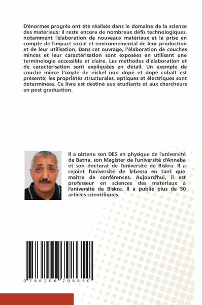 D'énormes progrès ont été réalisés dans le domaine de la science des matériaux; il reste encore de nombreux défis technologiques, notamment l'élaboration de nouveaux matériaux et la prise en compte de l'impact social et environnemental de leur production et de leur utilisation. Dans cet ouvrage, l'élaboration de couches minces et leur caractérisation sont exposées en utilisant une terminologie accessible et claire. Les méthodes d'élaboration et de caractérisation sont expliquées en détail. Un exemple de couche mince l'oxyde de nickel non dopé et dopé cobalt est présenté; les propriétés structurales, optiques et électriques sont déterminées. Ce livre est destiné aux étudiants et aux chercheurs en post graduation.