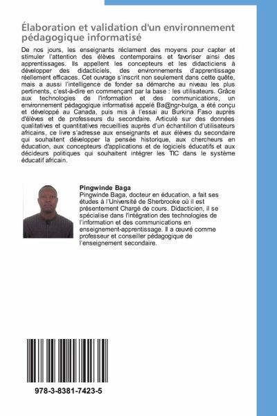 De nos jours, les enseignants réclament des moyens pour capter et stimuler l attention des élèves contemporains et favoriser ainsi des apprentissages. Ils appellent les concepteurs et les didacticiens à développer des didacticiels, des environnements d apprentissage réellement efficaces. Cet ouvrage s inscrit non seulement dans cette quête, mais a aussi l intelligence de fonder sa démarche au niveau les plus pertinents, c est-à-dire en commençant par la base : les utilisateurs. Grâce aux technologies de l'information et des communications, un environnement pédagogique informatisé appelé Ba@ngr-bulga, a été conçu et développé au Canada, puis mis à l essai au Burkina Faso auprès d'élèves et de professeurs du secondaire. Articulé sur des données qualitatives et quantitatives recueillies auprès d un échantillon d utilisateurs africains, ce livre s adresse aux enseignants et aux élèves du secondaire qui souhaitent développer la pensée historique, aux chercheurs en éducation, aux concepteurs d'applications et de logiciels éducatifs et aux décideurs politiques qui souhaitent intégrer les TIC dans le système éducatif africain.