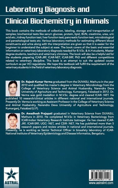 This book contains the methods of collection, labeling, storage and transportation of samples; biochemical tests like serum glucose, protein, lipid, BUN, creatinine, urea, uric acid etc.; kidney function test; liver function test; pancreatic function test, microbiological and parasitological tests etc. Various laboratory methods for estimating different blood constituents and urine along with the interpretation are given so that it is easier for the beginner to understand the subject at ease. The book covers all the basic and essential information on veterinary laboratory diagnosis needed for B.V.Sc. & A.H students, Master degree students, teachers and veterinary clinicians. The book will also be a helpful aid for the students preparing ICAR-JRF, ICAR-NET, ICAR-SRF, PhD and different competitions related to veterinary discipline. This book is an attempt to suit the updated course curriculum as per VCI regulations. We hope this textbook will fulfill the requirement of the veterinary students in the field of veterinary laboratory diagnosis.