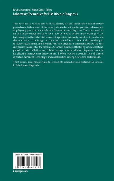1. An overview of sample collection and standard necropsy procedures for fish.- 2. Biosafety, Sterilization, and Disinfection Protocols.- 3. Common Staining Techniques in Laboratories.- 4. In vitro Susceptibility Assays for Bacterial Response to Antimicrobial Agents.- 5. Quality Assurance in Laboratory Practices and Equipment Maintenance: Ensuring Precision, Reliability, and Compliance.- 6. Methodological Approaches to Assess Innate Immune Responses of Fish.- 7. Fundamentals of innate immune system of shrimp.- 8. Disease in shrimp aquaculture: diagnostic technique for sustainable management.- 9. Fish Disease Diagnosis Methods: Assessment and Possible Applications.- 10. Genomic Approaches to Validate the Pathogenicity of Bacterial Fish Pathogens.- 11. Diagnostic techniques for fish Fungal Diseases.- 12. Disease Diagnosis and Control in Marine Fish Aquaculture.- 13. Molecular Techniques in Diagnosis of Fish Parasitic Infection.- 14. Hematological Techniques for Diagnosis of Fish Diseases.- 15. The Challenges of PCR Amplification in Disease Diagnosis.- 16. Histological Techniques in Fish Disease Diagnosis.- 17. Sensing Techniques for Microbial Pathogens.- 18. Hormonal regulation and disorder during fish disease.- 19. Applications of Monoclonal Antibodies for Detection of Fish Pathogens.- 20. Nanotherapeutics: An Approach for Fish Disease Treatment.- 21. Detection and Quantification of Tilapia Lake Virus (TiLV) and Tilapia Parvovirus (TiPV) by Real-Time PCR.- 22. Role of Artificial Intelligence in Fish Disease Modeling and Prognosis.- 23. Introduction to Microplastics: A Global Perspective of an Alarming Contaminant in the Aquatic Ecosystem.- 24. Emerging Challenges of Extended-Spectrum beta-Lactamase Producing Pathogen: Laboratory Strategies for Detection.- 25. eDNA Approaches for Ecosystem Health Monitoring: Focus on Pathogens, Vectors, and Microbial Assessment.1. An overview of sample collection and standard necropsy procedures for fish.- 2. Biosafety, Sterilization, and Disinfection Protocols.- 3. Common Staining Techniques in Laboratories.- 4. In vitro Susceptibility Assays for Bacterial Response to Antimicrobial Agents.- 5. Quality Assurance in Laboratory Practices and Equipment Maintenance: Ensuring Precision, Reliability, and Compliance.- 6. Methodological Approaches to Assess Innate Immune Responses of Fish.- 7. Fundamentals of innate immune system of shrimp.- 8. Disease in shrimp aquaculture: diagnostic technique for sustainable management.- 9. Fish Disease Diagnosis Methods: Assessment and Possible Applications.- 10. Genomic Approaches to Validate the Pathogenicity of Bacterial Fish Pathogens.- 11. Diagnostic techniques for fish Fungal Diseases.- 12. Disease Diagnosis and Control in Marine Fish Aquaculture.- 13. Molecular Techniques in Diagnosis of Fish Parasitic Infection.- 14. Hematological Techniques for Diagnosis of Fish Diseases.- 15. The Challenges of PCR Amplification in Disease Diagnosis.- 16. Histological Techniques in Fish Disease Diagnosis.- 17. Sensing Techniques for Microbial Pathogens.- 18. Hormonal regulation and disorder during fish disease.- 19. Applications of Monoclonal Antibodies for Detection of Fish Pathogens.- 20. Nanotherapeutics: An Approach for Fish Disease Treatment.- 21. Detection and Quantification of Tilapia Lake Virus (TiLV) and Tilapia Parvovirus (TiPV) by Real-Time PCR.- 22. Role of Artificial Intelligence in Fish Disease Modeling and Prognosis.- 23. Introduction to Microplastics: A Global Perspective of an Alarming Contaminant in the Aquatic Ecosystem.- 24. Emerging Challenges of Extended-Spectrum beta-Lactamase Producing Pathogen: Laboratory Strategies for Detection.- 25. eDNA Approaches for Ecosystem Health Monitoring: Focus on Pathogens, Vectors, and Microbial Assessment.