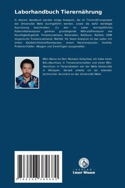In diesem Handbuch werden einige Analysen, die im Tierernährungslabor der Universität Wollo durchgeführt werden, sowie die dafür benötigte Ausrüstung beschrieben. Zu den im Labor durchgeführten Futtermittelanalysen gehören grundlegende Nährstoffanalysen wie Feuchtigkeitsgehalt, Trockensubstanz, Rohprotein, Rohfaser, Rohfett, ODM (organische Trockensubstanz), Rohfett. Für diese Analysen ist das Labor mit einem Kjeldahl-Stickstoffanalysator, einem Faseranalysator, Soxhlet, Probenschüttler, Waagen und Zentrifugen ausgestattet.