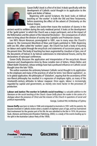Gavan Duffy's book is a first of its kind. It deals specifically with the development of Catholic Social Thought in its application to the rights and duties of labour. Beginning with sacred Scripture, it discusses those passages of both the Old and New testaments, which evidence biblical teaching in respect of what we would today call " the worker". The biblical attitude to the worker can be condensed to two words, "justice and fairness". The book discusses the institution of slavery in the ancient world, and shows how the advent of Christianity and its tenets, had the effect of ameliorating the condition of slaves throughout the Roman Empire. Labour and Justice then traces the evolution of slavery to serfdom during the early medieval period and the development of the "guild system" in which the Church was a major participant. The book discusses the decline of the guilds following the Reformation, the advent of the Industrial Revolution, the rise of the Proletarian class, and consequent division of society into Capitalist and Proletarian classes. The book discusses how Leo XIII's Rerum Novarum, promulgated in 1891, was in many ways the Church's answer to The Communist Manifesto of Marx and Engels published in 1848. Beginning with Leo XIII, often called the 'workers' pope', the Church has built a body of teaching on labour and capital through the encyclicals and statements of successive popes, up to the present time. This body of teaching has been augmented by Gaudium et Spes, one of the documents of Vatican II, by Vatican submissions to international forums ,and by the declarations of episcopal conferences. Gavan Duffy discusses the application and interpretation of the encyclicals Rerum Novarum and Quadragesimo Anno by those notable men of letters, Hilaire Belloc and Gilbert Keith Chesterton, whose writings have had a profound influence on Catholic social thought since the late 1920s. In the later chapters of the book, the author examines at length, the antinomy between Catholic social thought in its application to the employee, and many of the practices of what he terms 'Neo liberal capitalism', or, in its global application, the philosophy of 'Globalism'. He argues that the ascendancy of the neo-liberal philosophy has resulted in a regression of employee rights, as many of the 19th century attitudes to labour re appear. He says that once again, labour is increasingly regarded by capital and government, as merely one more factor in the processes of production. This, he argues, is contrary to Church teaching. Gavan Duffy raises the question as to whether the modern corporation, has departed from the model so ardently supported by Adam Smith, and raises the need for greater accountability by corporations to "the people," who originally conceded the benefits which corporations take for granted. The book examines work structures in which the employees are recognised as partners in the enterprise. It also looks at cooperative structures, such as those in the Mondragon region of the Basque country in Spain, as alternatives to traditional work structures. Labour and Justice: The worker in Catholic Social Teaching is a valuable addition to the literature on the social teaching of the Church - George Cardinal Pell, Archbishop of Sydney Gavan Duffy was born in India in 1946 emigrated to Australia in 1951 with his parents. He became involved in Catholic Action when a student of eighteen years of age, and has maintained that involvement for the greater part of his life. He was admitted to the Bar in 1974. His previous book, Demons and Democrats (2003), is a study aof the events leading up to the split in the Australian Labour Party of the 1950s.