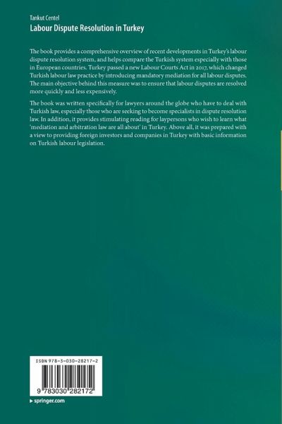 The book provides a comprehensive overview of recent developments in Turkey's labour dispute resolution system, and helps compare the Turkish system especially with those in European countries. Turkey passed a new Labour Courts Act in 2017, which changed Turkish labour law practice by introducing mandatory mediation for all labour disputes. The main objective behind this measure was to ensure that labour disputes are resolved more quickly and less expensively. The book was written specifically for lawyers around the globe who have to deal with Turkish law, especially those who are seeking to become specialists in dispute resolution law. In addition, it provides stimulating reading for laypersons who wish to learn what 'mediation and arbitration law are all about' in Turkey. Above all, it was prepared with a view to providing foreign investors and companies in Turkey with basic information on Turkish labour legislation.