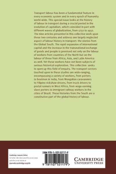 Transport labour has been a fundamental feature in every economic system and in every epoch of humanity worldwide. This volume considers the history of labour in transport from 1750 to 1950, in the context of globalisation and the evolution of capitalism. The nine articles presented in this collective work span these two centuries and address a largely neglected aspect of labour history in transport: the stories from the Global South (Africa, Asia and Latin America). The transport sectors touched upon in these studies are wide-ranging, encompassing a variety of workers, from porters to boatmen in India, from Mongolian caravanners to Filipino rickshaw drivers, from truck drivers to postal runners in west Africa, from wage-earning slave porters to immigrant railway workers in the cities of Brazil. These histories from the South are a constitutive part of the global history of labour.