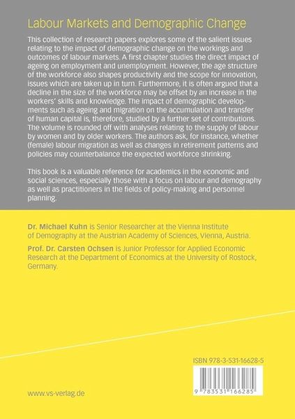This collection of research papers explores some of the salient issues relating to the impact of demographic change on the workings and outcomes of labour markets. A first chapter studies the direct impact of ageing on employment and unemployment. However, the age structure of the workforce also shapes productivity and the scope for innovation, issues which are taken up in turn. Furthermore, it is often argued that a decline in the size of the workforce may be offset by an increase in the workers' skills and knowledge. The impact of demographic developments such as ageing and migration on the accumulation and transfer of human capital is, therefore, studied by a further set of contributions. The volume is rounded off with analyses relating to the supply of labour by women and by older workers. The authors ask, for instance, whether (female) labour migration as well as changes in retirement patterns and policies may counterbalance the expected workforce shrinking.