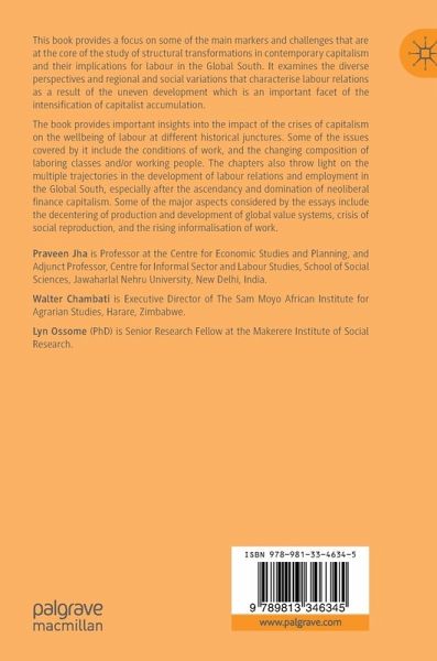 This book provides a focus on some of the main markers and challenges that are at the core of the study of structural transformations in contemporary capitalism and their implications for labour in the Global South. It examines the diverse perspectives and regional and social variations that characterise labour relations as a result of the uneven development which is an important facet of the intensification of capitalist accumulation.. The book provides important insights into the impact of the crises of capitalism on the wellbeing of labour at different historical junctures. Some of the issues covered by it include the conditions of work, and the changing composition of laboring classes and/or working people. The chapters also throw light on the multiple trajectories in the development of labour relations and employment in the Global South, especially after the ascendancy and domination of neoliberal finance capitalism. Some of the major aspects considered by the essays include the decentering of production and development of global value systems, crisis of social reproduction, and the rising informalisation of work.