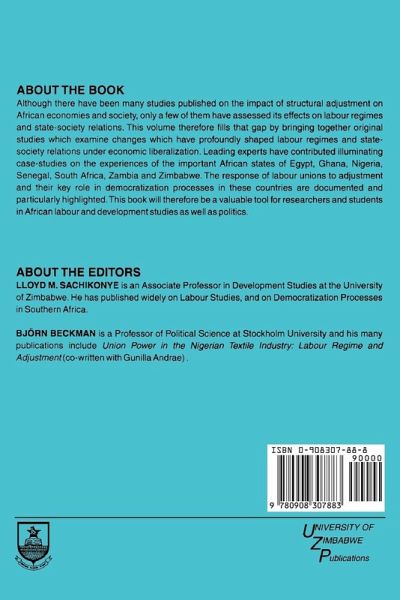 This collection of essays investigates how structural adjustment and economic liberalisation have impacted upon labour regimes - e.g., trade unions; and upon state and civil society relations, and processes of democratisation. The studies resulted from a conference hosted by the Institute of Development Studies, University of Zimbabwe, in co-operation with the Department of Political Science, University of Stockholm. Cases and responses of the seven African countries in attendance - Egypt, Ghana, Nigeria, Senegal, South Africa, Zambia and Zimbabwe - are documented. Examples include: liberalisation and the case of Senegalese industrial relations; trade unions and capacity building in the Nigerian textile industry; the labour exodus in a liberalising South Africa; and authoritarianism and trade unions in Egypt.