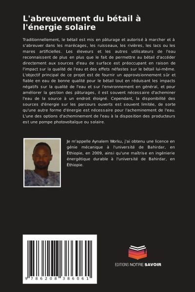Traditionnellement, le bétail est mis en pâturage et autorisé à marcher et à s'abreuver dans les marécages, les ruisseaux, les rivières, les lacs ou les mares artificielles. Les éleveurs et les autres utilisateurs de l'eau reconnaissent de plus en plus que le fait de permettre au bétail d'accéder directement aux sources d'eau de surface est préoccupant en raison de l'impact sur la qualité de l'eau et des effets néfastes sur le bétail lui-même. L'objectif principal de ce projet est de fournir un approvisionnement sûr et fiable en eau de bonne qualité pour le bétail tout en réduisant les impacts négatifs sur la qualité de l'eau et sur l'environnement en général, et pour améliorer la gestion des pâturages, il est souvent nécessaire d'acheminer l'eau de la source à un endroit éloigné. Cependant, la disponibilité des sources d'énergie sur les parcours ouverts est souvent limitée, de sorte qu'une autre forme d'énergie est nécessaire pour l'acheminement de l'eau. L'une des options d'acheminement de l'eau à la disposition des producteurs est une pompe photovoltaïque ou solaire.