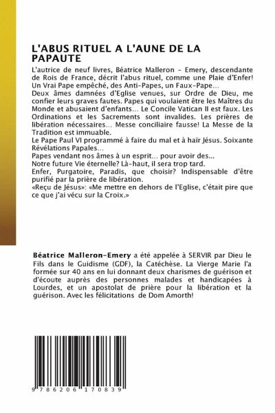 L'autrice de neuf livres, Béatrice Malleron - Emery, descendante de Rois de France, décrit l'abus rituel, comme une Plaie d'Enfer! Un Vrai Pape empêché, des Anti-Papes, un Faux-Pape...Deux âmes damnées d'Eglise venues, sur Ordre de Dieu, me confier leurs graves fautes. Papes qui voulaient être les Maîtres du Monde et abusaient d'enfants... Le Concile Vatican II est faux. Les Ordinations et les Sacrements sont invalides. Les prières de libération nécessaires... Messe conciliaire fausse! La Messe de la Tradition est immuable.Le Pape Paul VI programmé à faire du mal et à haïr Jésus. Soixante Révélations Papales... Papes vendant nos âmes à un esprit... pour avoir des... Notre future Vie éternelle? Là-haut, il sera trop tard. Enfer, Purgatoire, Paradis, que choisir? Indispensable d'être purifié par la prière de libération. «Reçu de Jésus»: «Me mettre en dehors de l'Eglise, c'était pire que ce que j'ai vécu sur la Croix.»