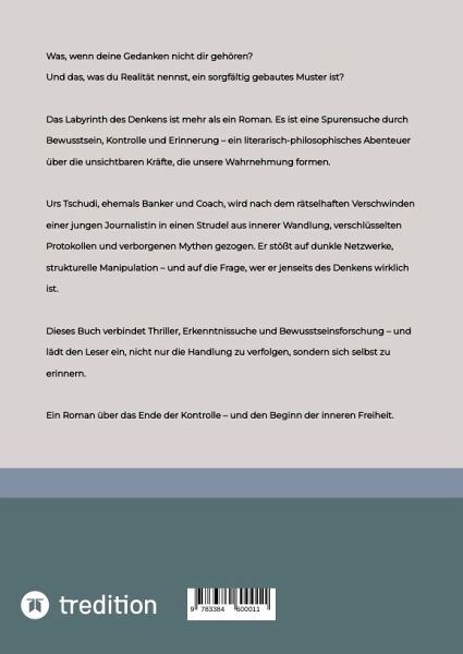 "Das Labyrinth des Denkens" ist ein literarischer Roman über verborgene Strukturen der Wahrnehmung, mentale Kontrolle und die Kraft innerer Resonanz. Urs Tschudi gerät nach dem Verschwinden einer Journalistin in ein Netz aus Mythen, Protokollen und Bewusstseinsforschung - und entdeckt dabei, dass wahre Freiheit nicht im Außen beginnt, sondern im eigenen Feld.