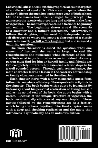 Labyrinth Lake is a semi-autobiographical account targeted at middle school aged girls. This account spans before the author's life up through her sophomore year of high school. (All of the names have been changed for privacy.) The manuscript is twenty chapters long and written in the form of vignettes. The manuscript contains a fictional beginning and ending. The beginning shares a real life scenario of a daughter and a father's interaction. Afterwards, it follows the daughter, in her need for independence and self-discovery to where she meets a character of a classic American novel, To Kill a Mockingbird and she is asked a haunting question. The main character is asked the question what one element of her soul she wants to keep. In real life remembrances she numerates what elements of her life she finds most important to her as an individual. As every person must find for him or herself family and friends are two completely different but essential relationships to be a well rounded person. Through each remembrance, the main character learns a lesson to the contrary of friendship or family closeness presented in the situation. Each chapter starts with a now memorable quote from influential members of history. These quotes directly link to the vignette. The book begins with a quote by journalist Sy Safransky about his personal realization of loving himself and as the actual text of the book, the quote begins with a dream. Because of the unique structure of vignettes, the book never actually climaxes at any one chapter. These quotes followed by the remembrances act as a fortiori which bring the book together. The final chapter comes with a deep and shocking realization and the quote that introduces it symbolically has an unknown author.