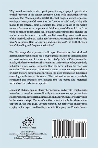 The Hekatompathia (1582), the first English sonnet sequence, surprises its readers with a cryptographic puzzle at a critical juncture in the text. The puzzle's instructions, enumerated in five points, promise that a message can be deciphered using a specific set of published cryptographic tables. This odd, indeed unique, interruption of a poetic text has long baffled critics. Some have dismissed the puzzle as esoterica; one critic argued that the puzzle is unsolvable because its construction is flawed; what no one has previously done is to solve the puzzle. And so, until now, the mystery has remained. However, by applying both cryptographic and literary skills, Labyrinth of Ruins uncovers the solution to this extraordinarily elaborate 7-stage puzzle, in which each stage produces a cryptographic message. Even more surprising, in its grand finale, the seventh stage's cryptographic message reveals that the work's author is not actually he whose name appears on the title page, Thomas Watson, but rather the philosopher, statesman, and harbinger of scientific progress, Francis Bacon. This study's arguments are quantifiable, unlike any matters of literary interpretation or authorship attribution based on the historical record. Indeed, false claims based on a true cryptographic system are difficult to concoct because such systems impose significant constraints. Mathematical techniques are applied to validate the deciphered messages. Solving the Hekatompathia's puzzle not only produces seven messages, but also reorders the sonnet sequence, producing what is, in effect, a new sequence with a different ending. Labyrinth of Ruins, in addition to solving the puzzle, is a critical study of the reordered sequence. The Hekatompathia, in its new order, provides valuable insights into the intellectual history of its day. It reveals much about early modern rhetorical practices, the role of natural philosophy (especially Lucretian cosmology) in Elizabethan poetry, and the structural organization of sonnet sequences. The Hekatompathia's poet, with the decipherer's assistance, has accomplished the unprecedented feat of publishing, what is effectively a new literary work four centuries after his death. Book's website: Hekatompathia.com