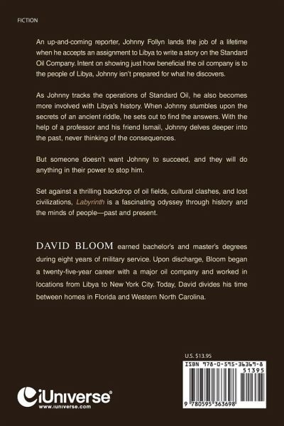 An up-and-coming reporter, Johnny Follyn lands the job of a lifetime when he accepts an assignment to Libya to write a story on the Standard Oil Company. Intent on showing just how beneficial the oil company is to the people of Libya, Johnny isn't prepared for what he discovers. As Johnny tracks the operations of Standard Oil, he also becomes more involved with Libya's history. When Johnny stumbles upon the secrets of an ancient riddle, he sets out to find the answers. With the help of a professor and his friend Ismail, Johnny delves deeper into the past, never thinking of the consequences. But someone doesn't want Johnny to succeed, and they will do anything in their power to stop him. Set against a thrilling backdrop of oil fields, cultural clashes, and lost civilizations, Labyrinth is a fascinating odyssey through history and the minds of people-past and present.