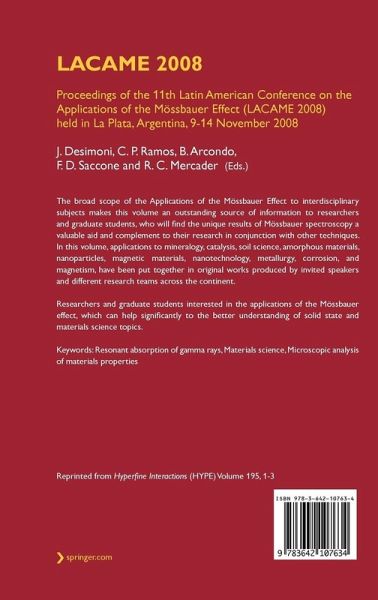 Eleventh Latin American conference on the applications of the Mössbauer effect, LACAME 2008, La Plata, Argentina, 9-14 November 2008.- Preface.- Fe/MCM-41 sylilated catalyst: structural changes determination during the Fischer-Tropsch reaction.- Reduction of hematite with ethanol to produce magnetic nanoparticles of Fe3O4, Fe1???x O or Fe0 coated with carbon.- Magnetic nanoparticles based on iron coated carbon produced from the reaction of Fe2O3 with CH4: a Mössbauer study.- Niobian iron oxides as heterogeneous Fenton catalysts for environmental remediation.- Magnetic minerals from volcanic Ultisols as heterogeneous Fenton catalysts.- Hematite reaction with tar to produce carbon/iron composites for the reduction of Cr(VI) contaminant.- Supported iron based redox systems for hydrogen production and storage from ethanol.- Mineralogical characterization of Greda clays and monitoring of their phase transformations on thermal treatment.- Mössbauer spectroscopy study of a mineral sample from Oshno Hill, District of Chavín de Pariarca, Huanuco Region, Peru.- Hematite from a mining area in the east border of Quadrilátero Ferrífero, Minas Gerais, Brazil.- Mössbauer studies of one representative hydromorphic soil of the coastal area of the Rio de La Plata.- 57Fe Mössbauer spectroscopy of radiation damaged samarskites and gadolinites.- Synthesis of hematite nanowires using a mesoporous hard template.- Mössbauer characterization of surface-coated magnetic nanoparticles for applications in transformers.- Formation of nanostructured Al 64 Cu 23 Fe 13 icosahedral quasicrystal by the ball milling technique.- Mössbauer and EXAFS spectroscopy investigation of iron and arsenic adsorption to lettuce leaves.- Characterization of corrosion products of a carbon steelscrew-nut set exposed to mountain weather conditions.- The role of the spinel phases on the rust activity in corroded steels.- On the reaction of iron oxides and oxyhydroxides with tannic and phosphoric acid and their mixtures.- Design of a conversion electron Mössbauer spectrometer based on an electron multiplier. Evaluation of the mean-escape-depth of the detected signals.- Magnetic properties of ?-Fe2O3 nanoparticles encapsulated in surface-treated polymer spheres.- Low temperature magnetic ordering in Fe-doped TiO 2 samples.- A quasi-continuous observation of the ?-transition of Fe1?+?x S by Mössbauer line tracking.- Mössbauer study of Fe-Co alloys with Cr additions synthesized by mechanical alloying.- Structure and soft magnetic properties of FINEMET type alloys: Fe73.5Si13.5Nb3???x Mo x B9Cu1 (x?=?1.5, 2).- Influence of silicon and atomic order on the magnetic properties of (Fe80Al20)100- x Si x nanostructured system.- Fe-doped SnO 2 nanopowders obtained by sol-gel and mechanochemical alloying with and without thermal treatment.- Crystallographic and 119Sn and 155Gd Mössbauer analyses of Gd5Ge2(Si1???xSnx)2 (x = 0.23 and x = 0.40).- A Mössbauer effect study of the Fe2+x Mn1-x Al Heusler alloys.- Mössbauer analysis of Nd-Co M-type strontium hexaferrite powders with different iron content.- Quasicrystalline phase formation in the mechanically alloyed Al70Cu20Fe10.- Structural and magnetic properties of Fe-Ni mecanosynthesized alloys.- Mössbauer study on Zn1???x Fe x O semiconductors prepared by high energy ball milling.- Hyperfine, structural and electrical transport properties of the high-energy milled (1 ? X).ZnO-X.FeO system.- Effect of Ni on the lattice parameter and the magnetic hyperfine field in(Fe70Al30)100???x Ni x alloys.- Characterization of scraps produced by the industrial laser cutting of steels.- Mössbauer spectroscopy analysis on a tempered martensitic 9% Cr steel.- Synthesis and characterization of silica-coated nanoparticles of magnetite.- Synthesis and characterization of superparamagnetic iron oxide nanoparticles for biomedical applications.