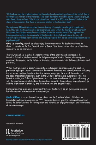 This volume gathers together the recent writings of the analysts and members of the Freudian School of Melbourne and the Belgian analyst Christian Fierens, displaying the ongoing interrogation by the School of Lacanian psychoanalysis into its history, theories and practices. Within the framework of Lacan's interventions in Freudian psychoanalysis, the book in particular highlights Lacan's inventions in theoretical discourse and clinical practice, including the no-sexual relation, the discursive structures of language, the school, the cartel and the pass. Theoretical shibboleths such as the Oedipus complex are questioned, while the historical writings of Sabina Spielrein are read and interpreted anew. Chapters also engage with the psychoanalysis of children, the questions posed by the psychoses to psychoanalysis and the intersection of creativity and the arts in new and original ways. Bringing together a range of expert contributions, this text will be an illuminating resource for scholars and practitioners of psychoanalysis.