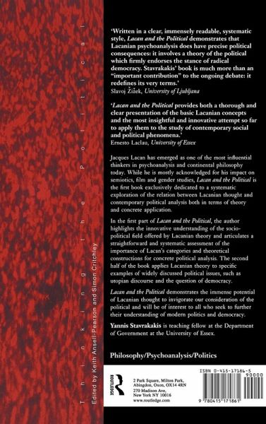 The work of Jacques Lacan is second only to Freud in its impact on psychoanalysis. Yannis Stavrakakis clearly examines Lacan's challenging views on time, history, language, alterity, desire and sexuality from a political standpoint. It is the first book to provide an overview of the social and political implications of Lacan's work as a whole for students coming to Lacan for the first time. The first part of Lacan and the Political offers a straightforward and systematic assessment of the importance of Lacan's categories and theoretical constructions for concrete political analysis. The second half of the book applies Lacanian theory to specific examples of widely discussed political issues, such as Green ideology, the question of democracy and the hegemony of advertising in contemporary culture.