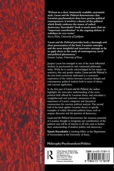 The work of Jacques Lacan is second only to Freud in its impact on psychoanalysis. Yannis Stavrakakis clearly examines Lacan's challenging views on time, history, language, alterity, desire and sexuality from a political standpoint. It is the first book to provide an overview of the social and political implications of Lacan's work as a whole for students coming to Lacan for the first time. The first part of Lacan and the Political offers a straightforward and systematic assessment of the importance of Lacan's categories and theoretical constructions for concrete political analysis. The second half of the book applies Lacanian theory to specific examples of widely discussed political issues, such as Green ideology, the question of democracy and the hegemony of advertising in contemporary culture.