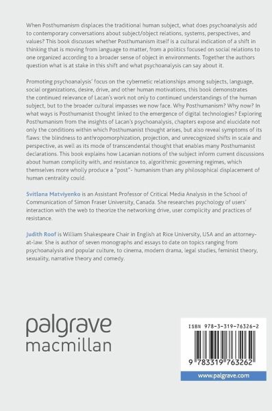 Promoting psychoanalysis' focus on the cybernetic relationships among subjects, language, social organizations, desire, drive, and other human motivations, this book demonstrates the continued relevance of Lacan's work not only to continued understandings of the human subject, but to the broader cultural impasses we now face. Why Posthumanism? Why now? In what ways is Posthumanist thought linked to the emergence of digital technologies? Exploring Posthumanism from the insights of Lacan's psychoanalysis, chapters expose and elucidate not only the conditions within which Posthumanist thought arises, but also reveal symptoms of its flaws: the blindness to anthropomorphization, projection, and unrecognized shifts in scale and perspective, as well as its mode of transcendental thought that enables many Posthumanist declarations. This book explains how Lacanian notions of the subject inform current discussions about human complicity with, and resistance to, algorithmic governing regimes, which themselves more wholly produce a "post"- humanism than any philosophical displacement of human centrality could.