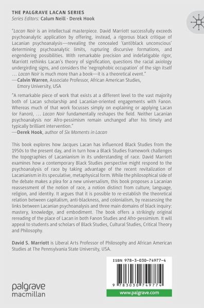 This book explores how Jacques Lacan has influenced Black Studies from the 1950s to the present day, and in turn how a Black Studies framework challenges the topographies of Lacanianism in its understanding of race. David Marriott examines how a contemporary Black Studies perspective might respond to the psychoanalysis of race by taking advantage of the recent revitalization of Lacanianism in its speculative, metaphysical form. While the philosophical side of the debate makes a plea for a new universalism, this book proposes a Lacanian reassessment of the notion of race, a notion distinct from culture, language, religion, and identity. It argues that it is possible to re-establish the theoretical relation between capitalism, anti-blackness, and colonialism, by reassessing the links between Lacanian psychoanalysis and three main domains of black inquiry: mastery, knowledge, and embodiment. The book offers a strikingly original rereading of the place of Lacan in both Fanon Studies and Afro-pessimism. It will appeal to students and scholars of Black Studies, Cultural Studies, Critical Theory and Philosophy.