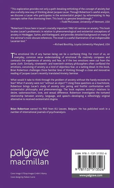 'This exploration of anxiety provides not only a path-breaking rethinking of the concept of anxiety but also a wholly new way of thinking about Jacques Lacan. Through Robertson's careful analysis, we discover a Lacan who participates in the existentialist project by reformulating its key concepts rather than dismissing them. This book is a genuine breakthrough.' - Todd McGowan, University of Vermont, USA