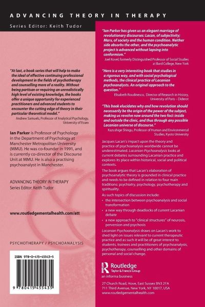 "What is most refreshing about Parker's approach in Lacanian Psychoanalysis - and what sets it aside from more sycophantic treatments of this topic - is the fact that Parker's evident commitment to this mode of clinical practice occurs alongside a sharpened critical nous. He represents a distinctive line of Lacanian thought, undercutting and questioning certain assumptions of psychoanalysis while working with and developing others. His devotion to ideology critique and critical psychology combines here with an attention to the specificity of the instruments of the psychoanalytic clinic and how they may be utilitsed towards non-ideological ends." - Derek Hook, Psychodynamic Practice, Volume 18, Issue 2, March 2012