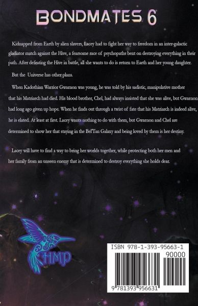 Bondmates #6 Kidnapped from Earth by alien slavers, Lacey had to fight her way to freedom in an inter-galactic gladiator match against the Hive, a fearsome race of psychopaths bent on destroying everything in their path. After defeating the Hive in battle, all she wants to do is return to Earth and her young daughter. But the Universe has other plans. When Kadothian Warrior Gwarnon was young, he was told by his sadistic, manipulative mother that his Matriarch had died. His blood brother, Chel, had always insisted that she was alive, but Gwarnon had long ago given up hope. When he finds out through a twist of fate that his Matriarch is indeed alive, he is elated. At least at first. Lacey wants nothing to do with them, but Gwarnon and Chel are determined to show her that staying in the Bel'Tan Galaxy and being loved by them is her destiny. Lacey will have to find a way to bring her worlds together, while protecting both her men and her family from an unseen enemy that is determined to destroy everything she holds dear. Author's note; It is HIGHLY suggested you read Roxy's Warriors and Tara's Warriors first, as there is a slight time overlap with all three books.