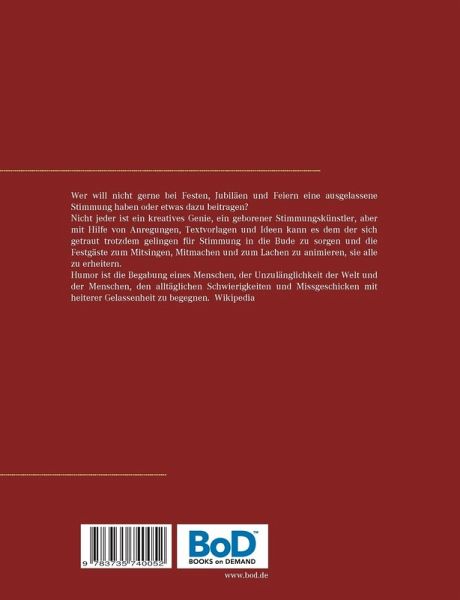 Wer will nicht gerne bei Festen, Jubiläen und Feiern eine ausgelassene Stimmung haben oder etwas dazu beitragen? Nicht jeder ist ein kreatives Genie, ein geborener Stimmungskünstler, aber mit Hilfe von Anregungen, Textvorlagen und Ideen kann es dem der sich getraut trotzdem gelingen für Stimmung in die Bude zu sorgen und die Festgäste zum Mitsingen, Mitmachen und zum Lachen zu animieren.Humor ist die Begabung eines Menschen, der Unzulänglichkeit der Welt und der Menschen, den alltäglichen Schwierigkeiten und Missgeschicken mit heiterer Gelassenheit zu begegnen. Wikipedia