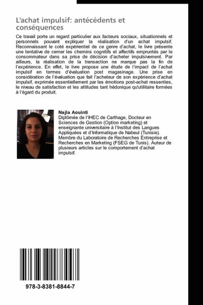 Ce travail porte un regard particulier aux facteurs sociaux, situationnels et personnels pouvant expliquer la réalisation d un achat impulsif. Reconnaissant le coté expérientiel de ce genre d achat, le livre présente une tentative de cerner les chemins cognitifs et affectifs empruntés par le consommateur dans sa prise de décision d acheter impulsivement. Par ailleurs, la réalisation de la transaction ne marque pas la fin de l expérience. En effet, le livre propose une étude de l impact de l achat impulsif en termes d évaluation post magasinage. Une prise en considération de l évaluation que fait l acheteur de son expérience d achat impulsif, exprimée essentiellement par les émotions post-achat ressenties, le niveau de satisfaction et les attitudes tant hédonique qu'utilitaire formées à l égard du produit.