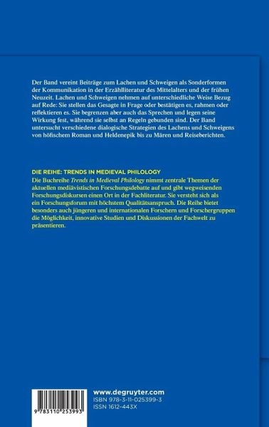 Der Band vereint Beiträge zum Lachen und Schweigen als Sonderformen der Kommunikation in der Erzählliteratur des Mittelalters und der frühen Neuzeit. Lachen und Schweigen nehmen auf unterschiedliche Weise Bezug auf Rede: Sie stellen das Gesagte in Frage oder bestätigen es, rahmen oder reflektieren es. Sie begrenzen aber auch das Sprechen und legen seine Wirkung fest, während sie selbst an Regeln gebunden sind. Der Band untersucht verschiedene dialogische Strategien des Lachens und Schweigens von höfischem Roman und Heldenepik bis zu Mären und Reiseberichten.