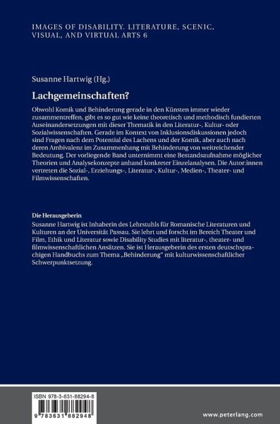 Susanne Hartwig ist Inhaberin des Lehrstuhls für Romanische Literaturen und Kulturen an der Universität Passau. Sie lehrt und forscht im Bereich Theater und Film, Ethik und Literatur sowie Disability Studies mit literatur-, theater- und filmwissenschaftlichen Ansätzen. Sie ist Herausgeberin des ersten deutschsprachigen Handbuchs zum Thema ¿Behinderung¿ mit kulturwissenschaftlicher Schwerpunktsetzung.