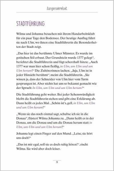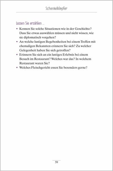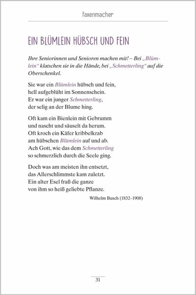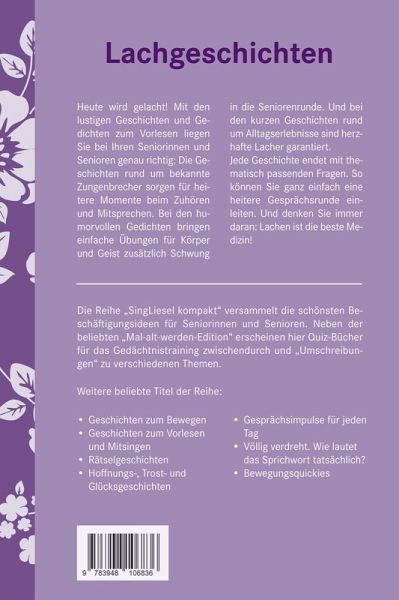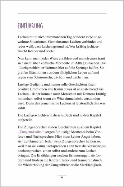 Lachgeschichten Heute wird gelacht! Mit den lustigen Geschichten und Gedichten zum Vorlesen liegen Sie bei älteren Menschen genau richtig: Die Geschichten rund um bekannte Zungenbrecher sorgen für heitere Momente beim Zuhören und Mitsprechen. Bei den humorvollen Gedichten bringen einfache Übungen für Körper und Geist zusätzlich Schwung in die Runde. Und bei den kurzen Geschichten rund um Alltagserlebnisse sind herzhafte Lacher garantiert. Jede Geschichte endet mit thematisch passenden Fragen. So können Sie ganz einfach eine heitere Gesprächsrunde einleiten. Und denken Sie immer daran: Lachen ist die beste Medizin!