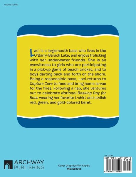 Laci is a largemouth bass who lives in the O'Barry-Barack Lake, and enjoys frolicking with her underwater friends. She is an eyewitness to girls who are participating in a pick-up game of beach cricket, and to boys darting back-and-forth on the shore. Being a responsible bass, Laci returns to Capture Cove to feed and bring home larvae for the fries. Following a nap, she ventures out to celebrate National Basking Day for Bass wearing her favorite t-shirt and stylish red, green, and gold-colored beret.