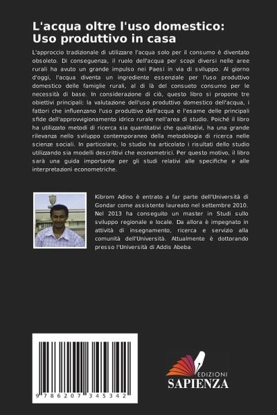 L'approccio tradizionale di utilizzare l'acqua solo per il consumo è diventato obsoleto. Di conseguenza, il ruolo dell'acqua per scopi diversi nelle aree rurali ha avuto un grande impulso nei Paesi in via di sviluppo. Al giorno d'oggi, l'acqua diventa un ingrediente essenziale per l'uso produttivo domestico delle famiglie rurali, al di là del consueto consumo per le necessità di base. In considerazione di ciò, questo libro si propone tre obiettivi principali: la valutazione dell'uso produttivo domestico dell'acqua, i fattori che influenzano l'uso produttivo dell'acqua e l'esame delle principali sfide dell'approvvigionamento idrico rurale nell'area di studio. Poiché il libro ha utilizzato metodi di ricerca sia quantitativi che qualitativi, ha una grande rilevanza nello sviluppo contemporaneo della metodologia di ricerca nelle scienze sociali. In particolare, lo studio ha articolato i risultati dello studio utilizzando sia modelli descrittivi che econometrici. Per questo motivo, il libro sarà una guida importante per gli studi relativi alle specifiche e alle interpretazioni econometriche.