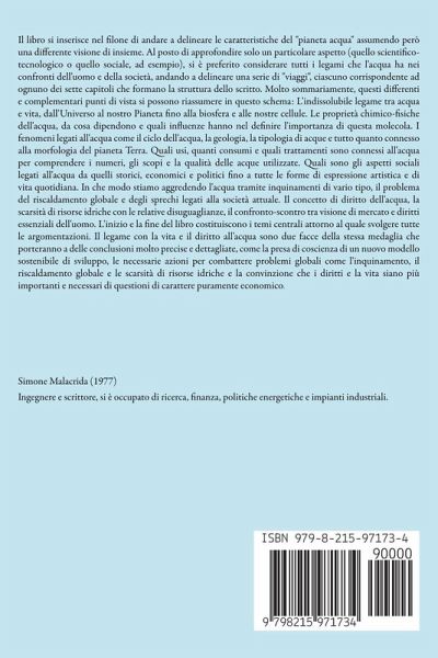 Il libro si inserisce nel filone di andare a delineare le caratteristiche del "pianeta acqua" assumendo però una differente visione di insieme. Al posto di approfondire solo un particolare aspetto (quello scientifico-tecnologico o quello sociale, ad esempio), si è preferito considerare tutti i legami che l'acqua ha nei confronti dell'uomo e della società, andando a delineare una serie di "viaggi", ciascuno corrispondente ad ognuno dei sette capitoli che formano la struttura dello scritto. Molto sommariamente, questi differenti e complementari punti di vista si possono riassumere in questo schema: L'indissolubile legame tra acqua e vita, dall'Universo al nostro Pianeta fino alla biosfera e alle nostre cellule. Le proprietà chimico-fisiche dell'acqua, da cosa dipendono e quali influenze hanno nel definire l'importanza di questa molecola. I fenomeni legati all'acqua come il ciclo dell'acqua, la geologia, la tipologia di acque e tutto quanto connesso alla morfologia del pianeta Terra. Quali usi, quanti consumi e quali trattamenti sono connessi all'acqua per comprendere i numeri, gli scopi e la qualità delle acque utilizzate. Quali sono gli aspetti sociali legati all'acqua da quelli storici, economici e politici fino a tutte le forme di espressione artistica e di vita quotidiana. In che modo stiamo aggredendo l'acqua tramite inquinamenti di vario tipo, il problema del riscaldamento globale e degli sprechi legati alla società attuale. Il concetto di diritto dell'acqua, la scarsità di risorse idriche con le relative disuguaglianze, il confronto-scontro tra visione di mercato e diritti essenziali dell'uomo. L'inizio e la fine del libro costituiscono i temi centrali attorno al quale svolgere tutte le argomentazioni. Il legame con la vita e il diritto all'acqua sono due facce della stessa medaglia che porteranno a delle conclusioni molto precise e dettagliate, come la presa di coscienza di un nuovo modello sostenibile di sviluppo, le necessarie azioni per combattere problemi globali come l'inquinamento, il riscaldamento globale e le scarsità di risorse idriche e la convinzione che i diritti e la vita siano più importanti e necessari di questioni di carattere puramente economico.